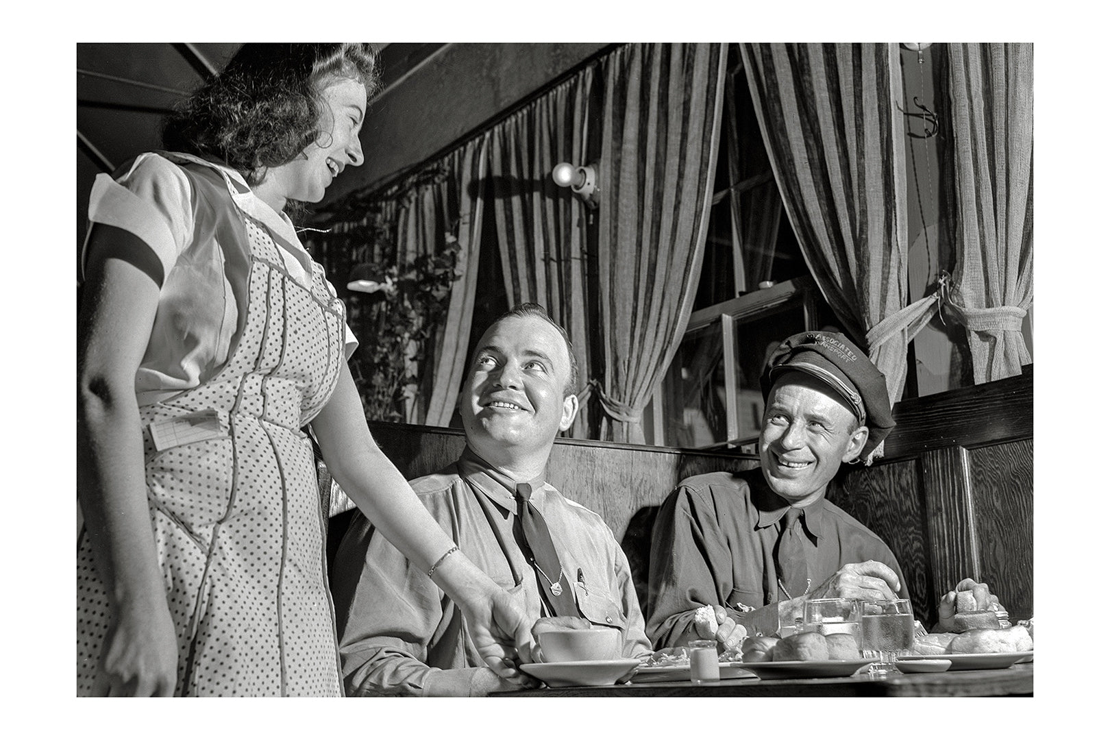 Candid 1940s Diner Photo Wall Art: Waitress Talking to Patrons Poster