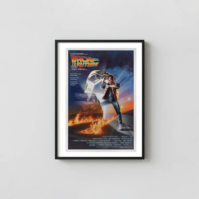 The electric blue, amber, and deep midnight palette of Back to the Future wall art works exceptionally well against white, light grey, or off-white walls in a modern, industrial, or retro-styled room. A large-format DeLorean movie poster or the original 1985 theatrical print commands a living room or media room feature wall naturally at 24×36. Frame in brushed aluminium or slim black metal and leave space on either side — the composition breathes better with room around it, and the lightning trails need space to read correctly.