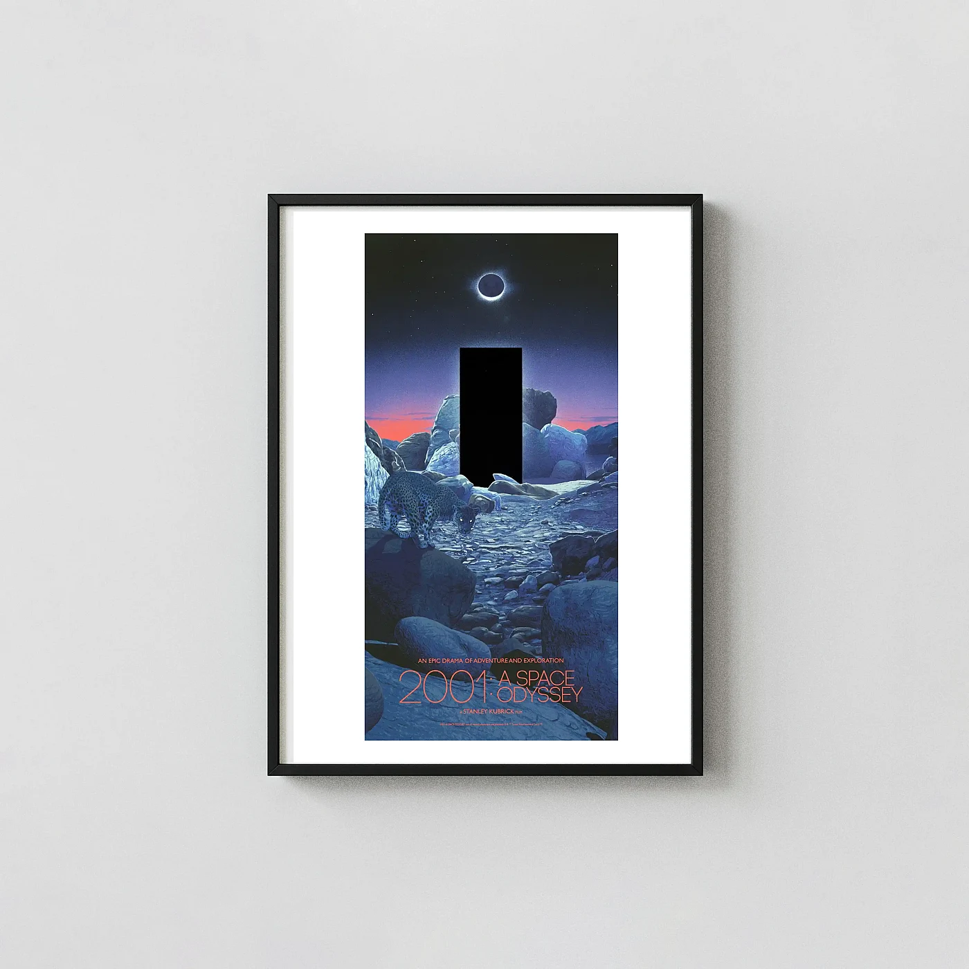 Evocative Mondo poster by Matthew Woodson for 2001: A Space Odyssey. Features the iconic Monolith and leopard in the ‘Dawn of Man’ setting. Must-have Kubrick sci-fi art.