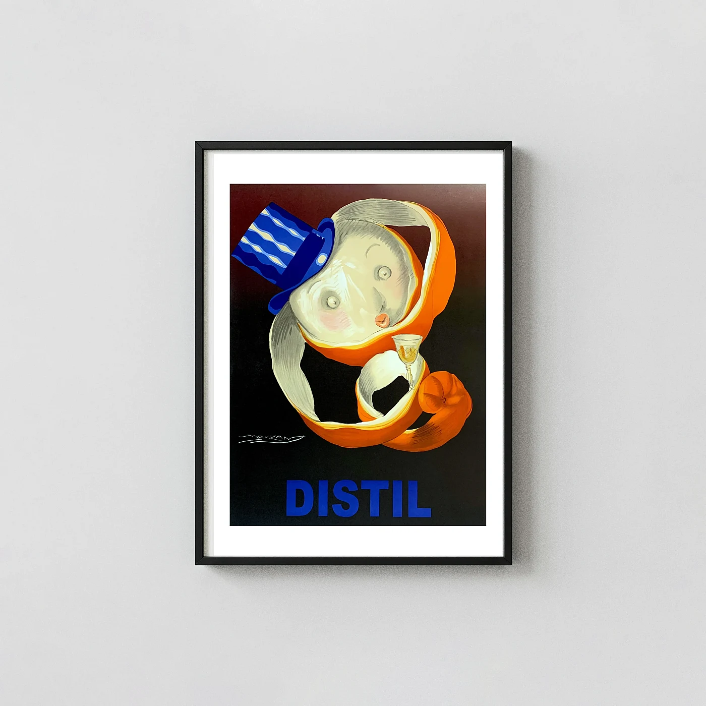 Own a piece of vintage advertising history with this striking “Distil” poster by Achille Mauzan (1920s). Features a playful, top-hatted orange peel character. Perfect for bars and kitchens.