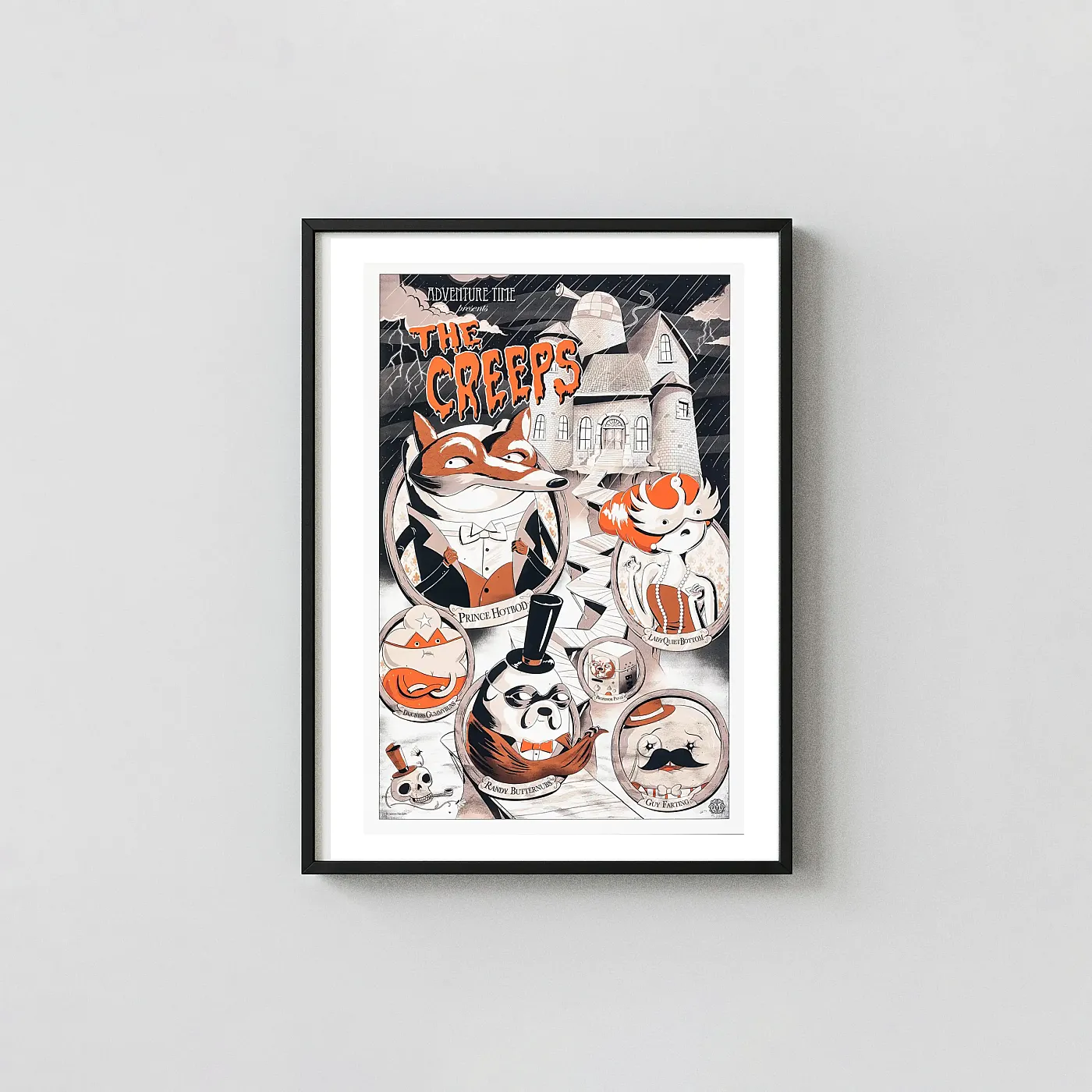 The artwork brilliantly reinterprets the Land of Ooo’s iconic characters—including Finn as “Prince Hotbod,” Jake as “Randy Butternubs,” Princess Bubblegum as “Lady Quietbottom,” and BMO as “Professor Pants”—in a stunning, vintage detective/noir aesthetic. The limited color palette of black, white, and burnt orange enhances the eerie atmosphere of the haunted manor setting shown in the background. With bold, theatrical typography and detailed character portraits, this poster captures the chaotic fun and creepy suspense of the murder mystery plot.