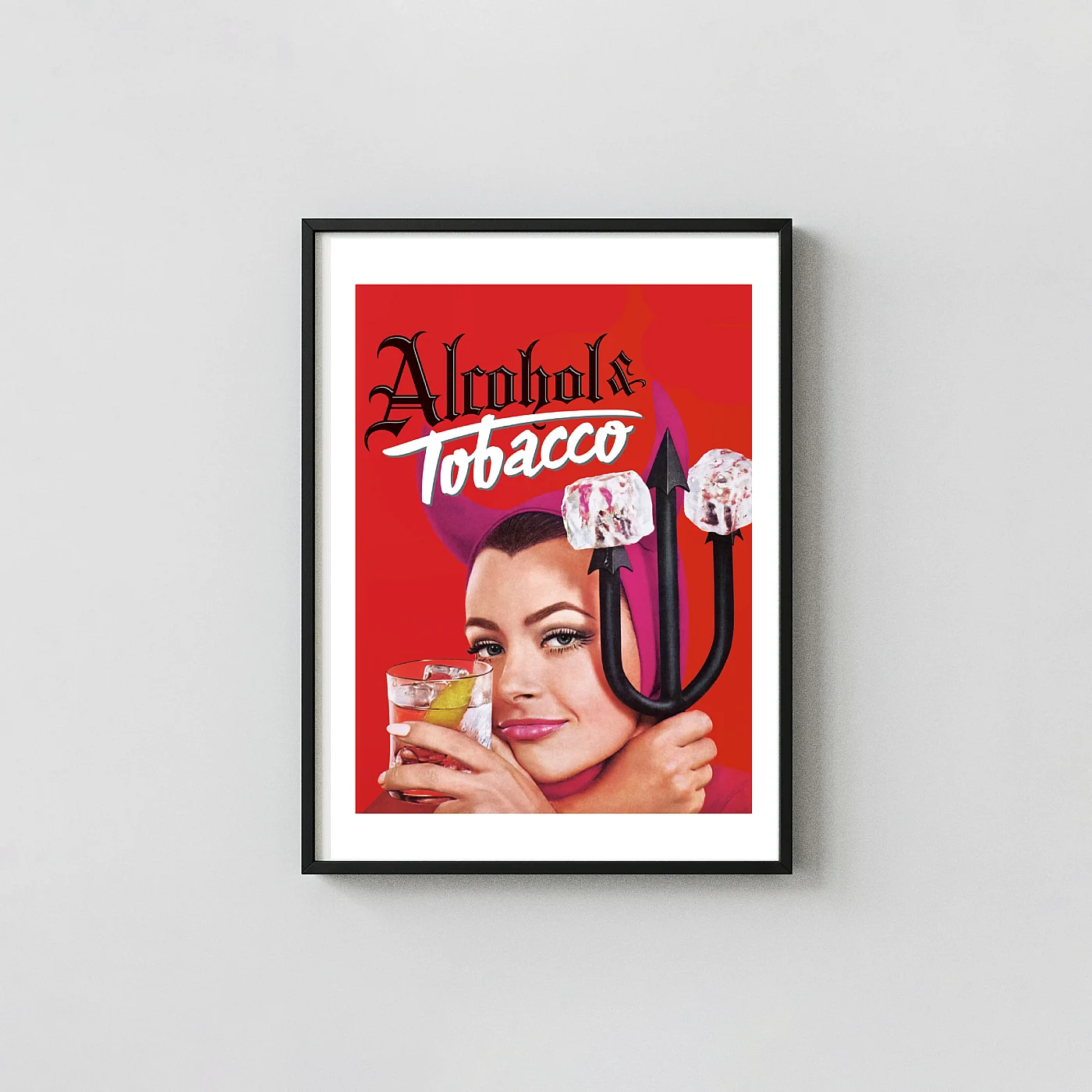 Dive into a world of intoxicating retro allure with this striking “Alcohol & Tobacco” art print. This highly stylized piece captures the essence of mid-century advertising and pin-up culture, subverting it with a deliciously dark theme. Against a fiery red backdrop, a glamorous woman, adorned with devilish horns and an irresistible gaze, presents a tempting cocktail. The message is clear, bold, and unapologetically edgy. The strong color palette and dramatic composition make this a true centerpiece.