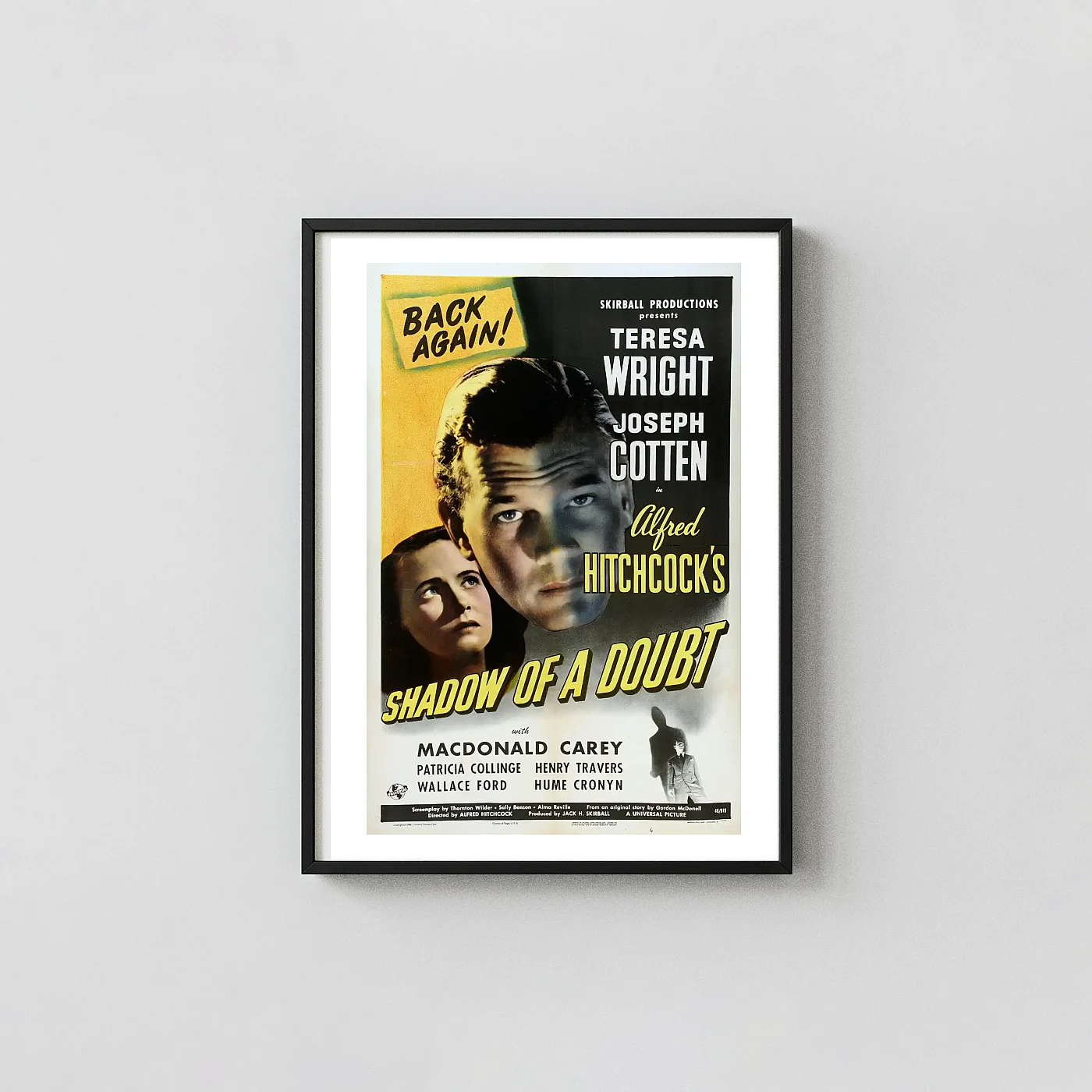Capture the chilling suspense of Alfred Hitchcock’s psychological thriller with this stunning vintage poster art for Shadow of a Doubt (1943/1946 re-release). This iconic design features an intense, dramatically lit close-up of stars Joseph Cotten and Teresa Wright, perfectly reflecting the dark tension at the heart of this classic film noir masterpiece. The vibrant yellow and stark black contrast, characteristic of this era’s promotional materials, along with the striking ‘BACK AGAIN!’ re-release typography, make this poster a phenomenal piece of cinematic history and highly engaging wall art.