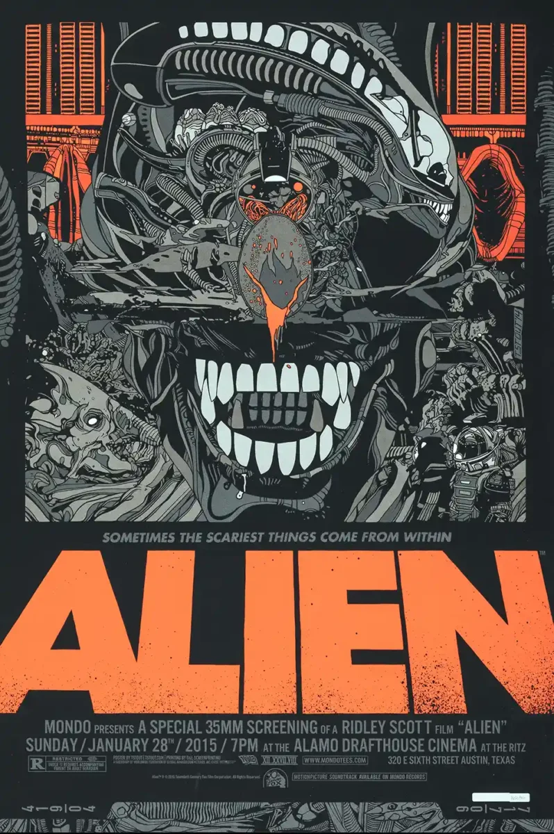 Own the terrifying Tyler Stout Mondo poster for Ridley Scott’s Alien. Featuring the Xenomorph, Facehugger, and industrial horror detail. Perfect for collectors.