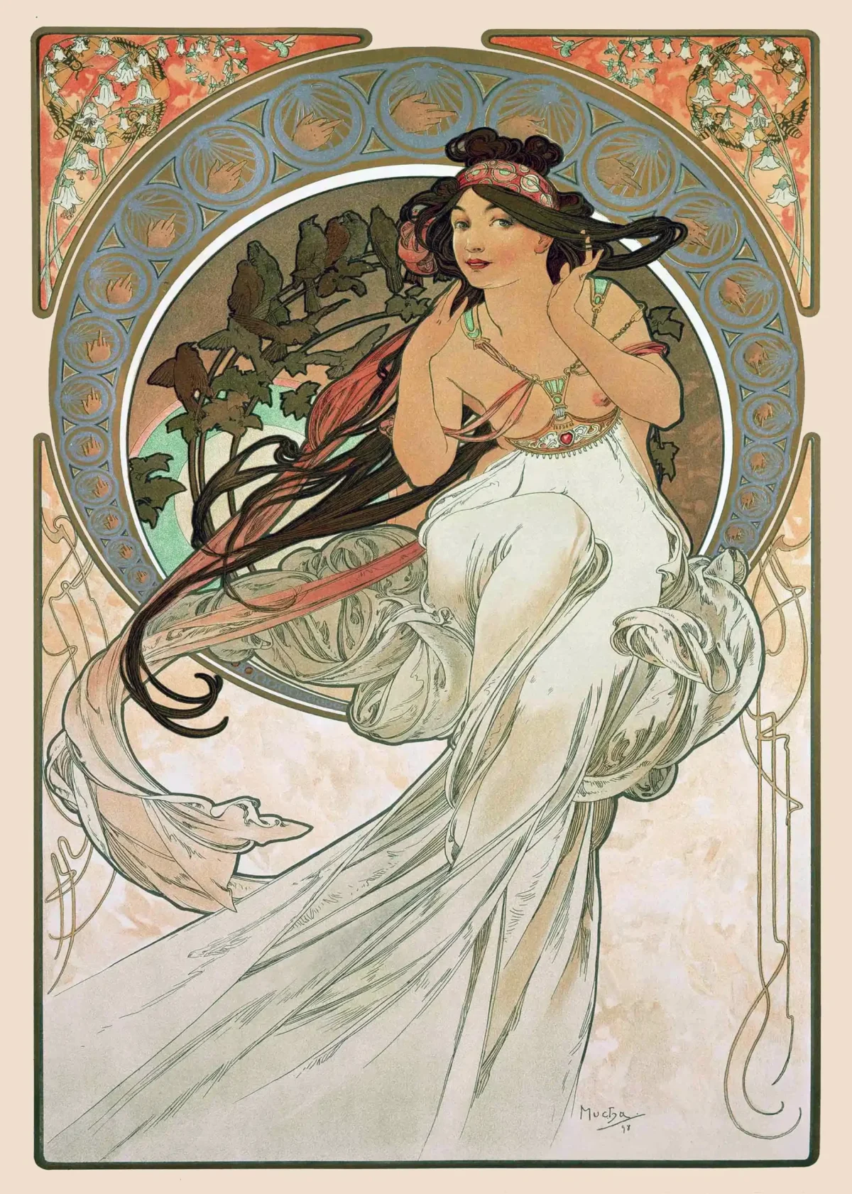 Mucha, the master of the fin-de-siècle aesthetic, captures the essence of music not just visually, but emotionally. The central figure—a languid woman with cascading dark hair and flowing white drapery—evokes movement and rhythm. Her pose suggests deep engagement with an unseen soundscape, perhaps the song of the birds nestled in the background foliage. The design is framed by the signature Mucha “halo” of detailed, ornate gold and blue patterns, complemented by rich earth tones and delicate floral elements, including buzzing bees and white bellflowers.