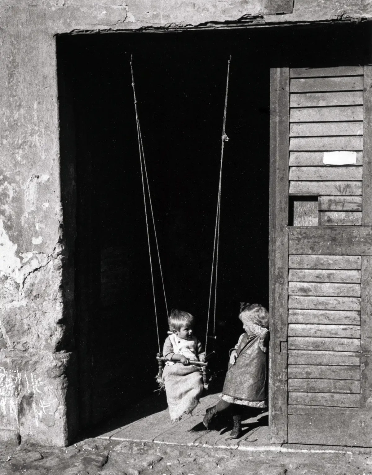 Capture the poignant beauty of 20th-century photojournalism with this exceptional art poster by the master, André Kertész. Known for his lyrical and intimate perspective, this iconic black and white photograph captures two children playing on a makeshift swing, dramatically framed within a dark, rustic archway. The scene beautifully employs high contrast and deep shadows, highlighting the innocence of the subjects against a stark, compelling background. This piece is a quintessential example of Kertész’s genius, making it a powerful statement piece for any collector or lover of classic photography and fine wall art.
