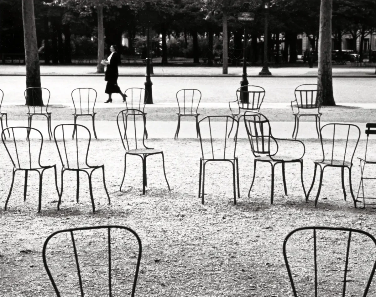Capture the timeless genius of Hungarian photographer André Kertész with this iconic image, “Chairs, Avenue des Champs-Élysées,” taken in Paris around 1929. This fine art poster features the stark, evocative composition for which Kertész is famous: a scattered array of empty wire chairs set against the backdrop of a Parisian park, with a lone figure passing by in the distance. It is a masterpiece of observational photography, offering a sense of solitude, geometry, and urban melancholy, making it essential wall art for collectors and art enthusiasts.