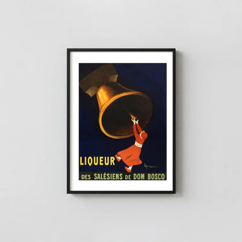 The poster features Cappiello’s signature technique of isolating a vibrant subject against a dark, monochromatic background—in this case, a rich, midnight blue. A luminous golden bell dominates the upper frame, contrasting sharply with the mysterious darkness. Below, a small figure, clad dramatically in flowing red robes, reaches upward, seemingly attempting to draw the very essence (or the liqueur itself) from the bell’s clapper. This dynamic composition and powerful color palette ensure that the poster remains visually arresting over a century later. It serves not just as a piece of vintage alcohol memorabilia, but as a defining example of Italian poster design that shaped modern graphic arts. Bring this theatrical slice of history and luxury into your home or office space.