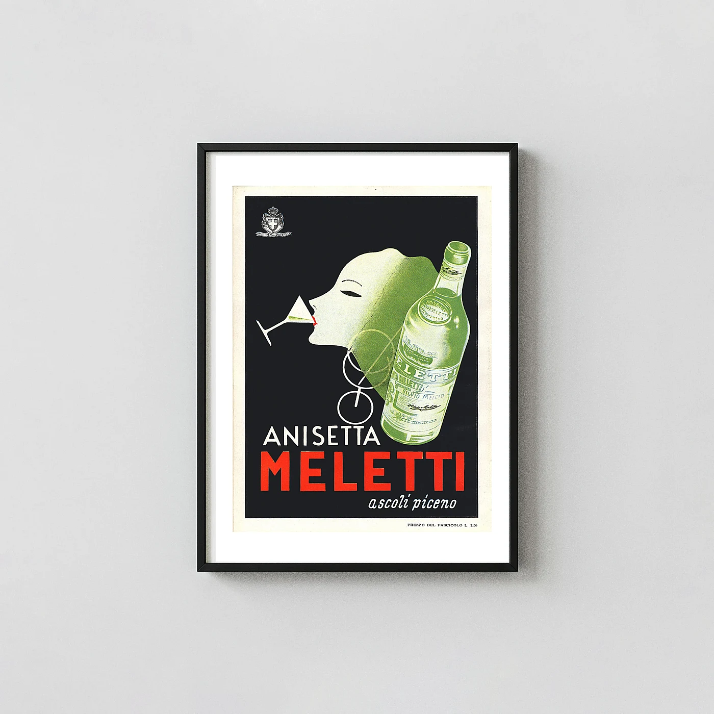 Celebrate Italian vintage design with this striking Anisetta Meletti poster. Features bold Art Deco style, a woman enjoying the liqueur, and the iconic green bottle. Perfect for bars or kitchens.