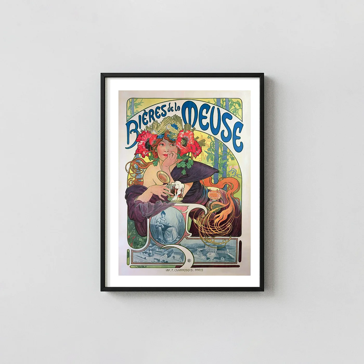 Art Nouveau classic Bierès de la Meuse Poster by Alphonse Mucha (1897) is built for buyers who want vintage alcohol and liquor posters with real wall presence, not filler decor. The print is available in multiple sizes, with digital download support for faster custom framing.