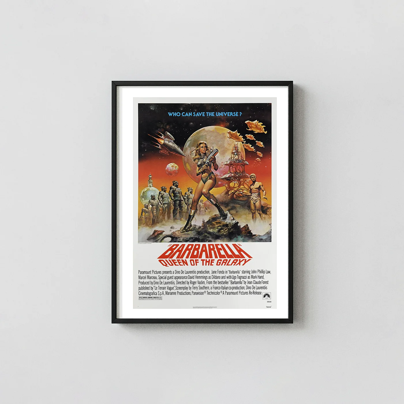 Get the iconic Barbarella (1968) movie poster featuring Jane Fonda as the Queen of the Galaxy. Premium quality sci-fi wall art print. Perfect gift for retro film fans.