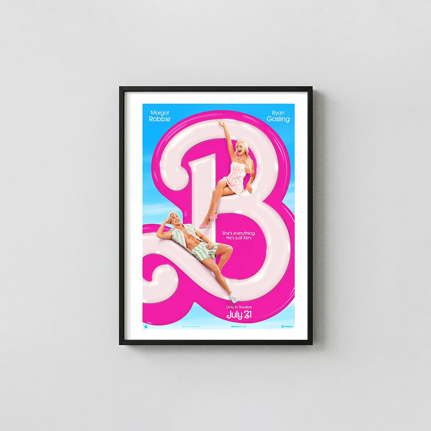 Step into the vibrant world of Barbieland with this official Barbie (2023) movie poster. This stunning wall art features stars Margot Robbie as Barbie and Ryan Gosling as Ken, playfully posed on the iconic, candy-colored ‘B’ initial. Capturing the film’s signature humor and eye-popping hot pink aesthetic, this poster also includes the memorable tagline: “She’s everything. He’s just Ken.” It’s a must-have piece of movie memorabilia that perfectly embodies the fun and energy of Greta Gerwig’s blockbuster hit.