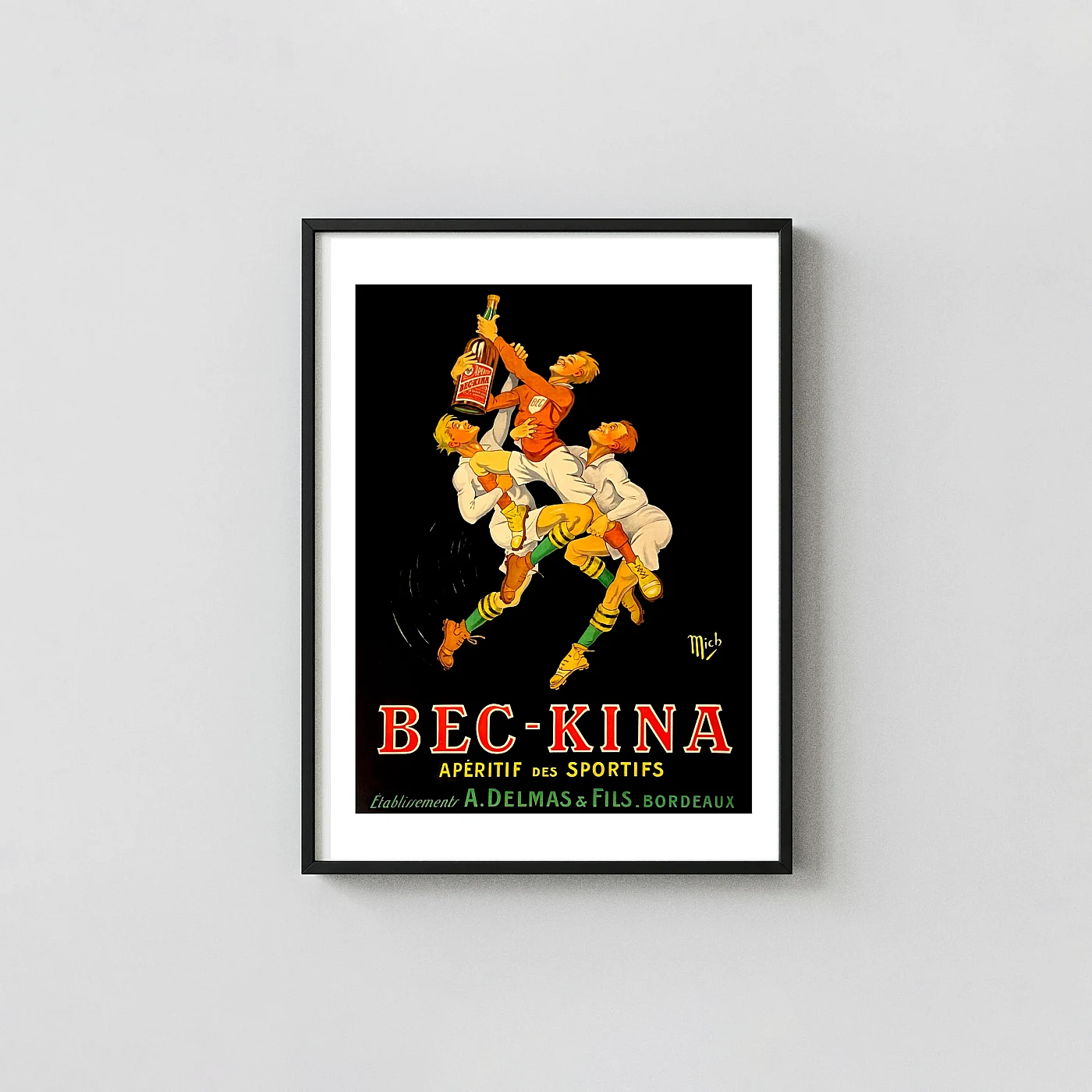 Capture the thrilling energy of early 20th-century French advertising with this stunning reproduction of the BEC-KINA “Apéritif des Sportifs” poster. Created by the artist Mich, this highly dynamic piece uses a bold Art Deco style, emphasizing movement and vitality. The illustration depicts three triumphant athletes, likely rugby or football players, piled high in a joyful celebration as they raise the coveted bottle of the Bordeaux-based BEC-KINA aperitif against a dramatic black backdrop. The vibrant colors—deep reds, golden yellows, and bright greens in the uniforms—make this print an immediate focal point in any room.