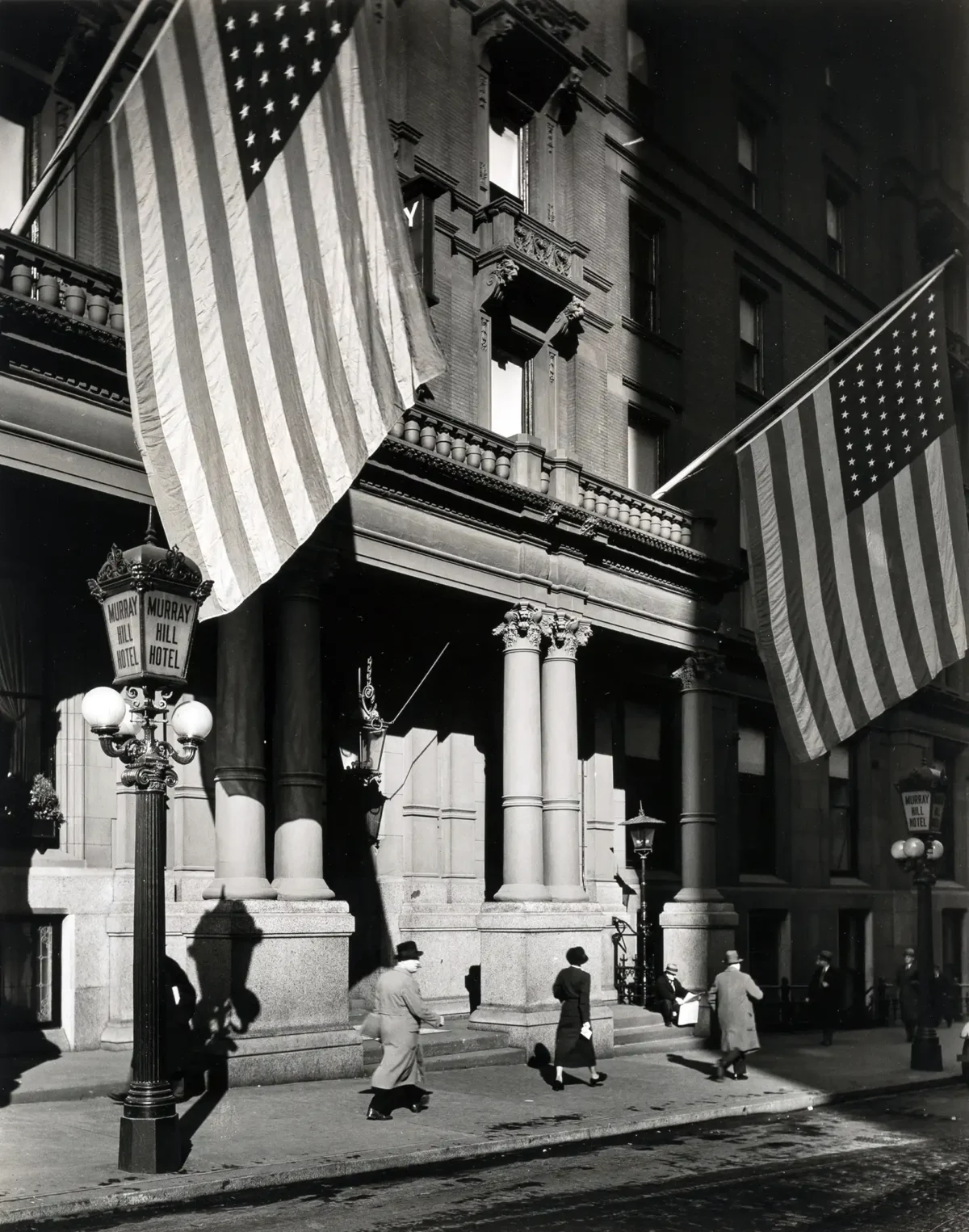 Capture the historic grandeur of Manhattan with this stunning vintage photography poster by the acclaimed artist, Berenice Abbott. Taken as part of her influential ‘Changing New York’ project, this image features the majestic entrance of the Murray Hill Hotel. The composition is masterful, highlighting the dramatic architecture, the stark contrast of the black and white medium, and the patriotic presence of two large American flags. This piece is a powerful slice of 1930s New York City life and wall art history, perfect for those who appreciate documentary photography and classic urban scenes.