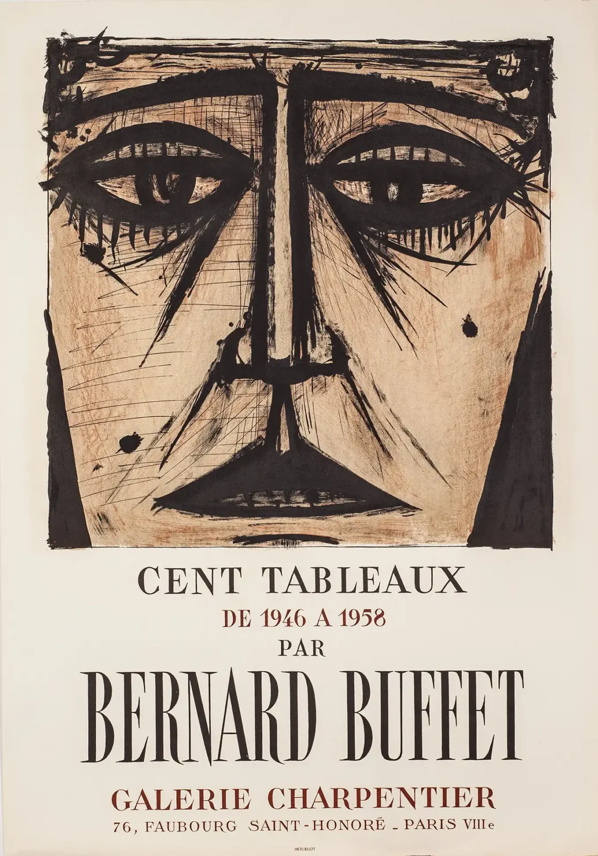 This striking lithograph poster advertises Bernard Buffet’s highly significant “Cent Tableaux” (100 Paintings) exhibition held at the prestigious Galerie Charpentier in Paris in 1958. Buffet, a master of Expressionism and a leading figure in the post-war School of Paris, is renowned for his stark, angular figures and dark, somber palette. This specific poster features a powerful, close-up portrait executed in his signature Misérabiliste style, using aggressive black lines and subtle tan washes. It serves not only as a piece of vintage advertising but as a seminal example of Modern French Art. Adding this dramatic Bernard Buffet wall art to your collection connects you directly to the influential mid-century art scene.