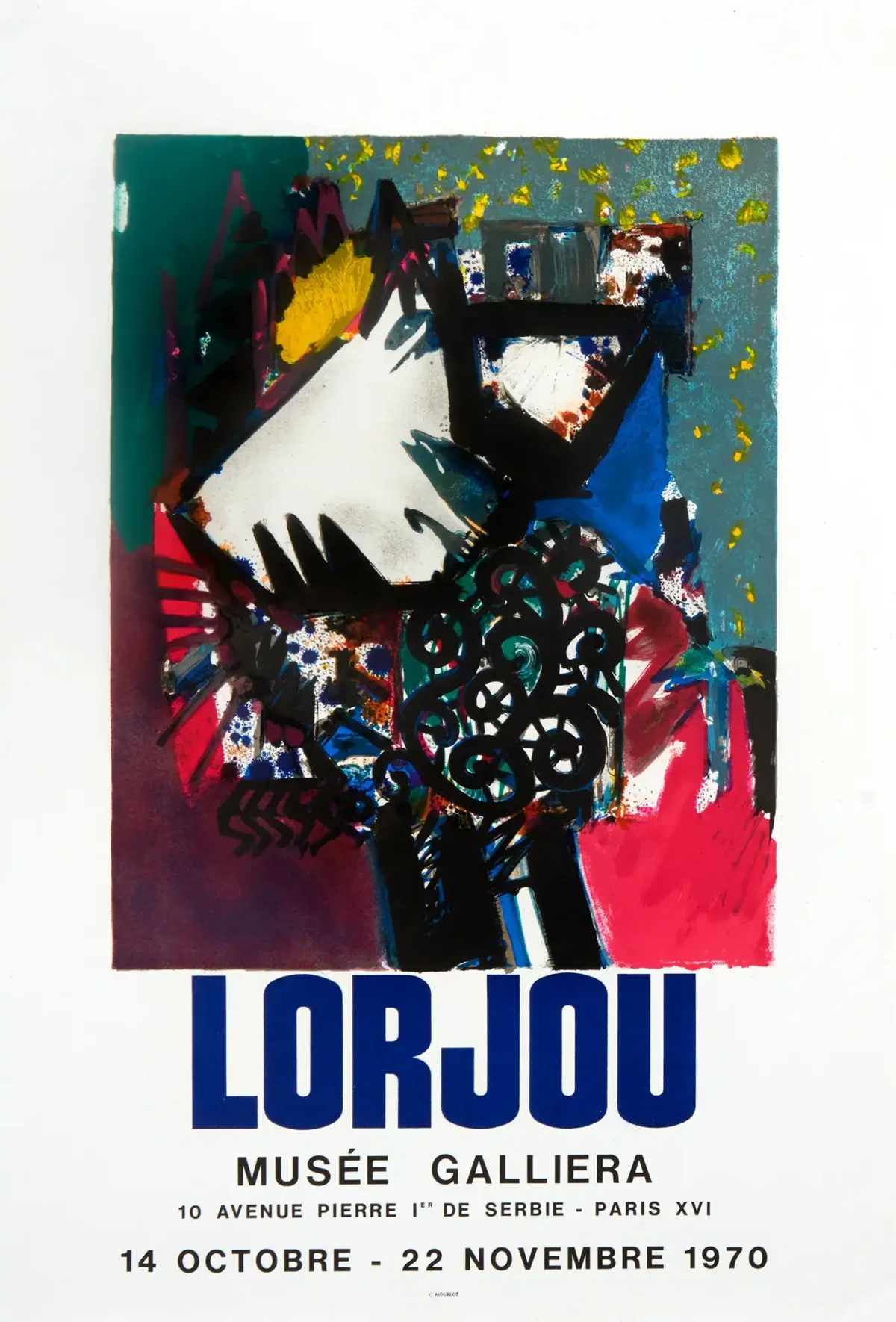 Celebrate the impactful style of French artist Bernard Lorjou with this stunning vintage exhibition poster, originally created for his 1970 show at the prestigious Musée Galliera in Paris. A masterpiece of post-war abstraction, this poster captures Lorjou’s signature dynamic use of color and texture. The central abstract composition bursts with deep magentas, teal greens, electric blues, and sharp black accents, standing in stark contrast to the clean white field. This Lorjou wall art is more than just decor; it’s a piece of 20th-century Parisian art history.