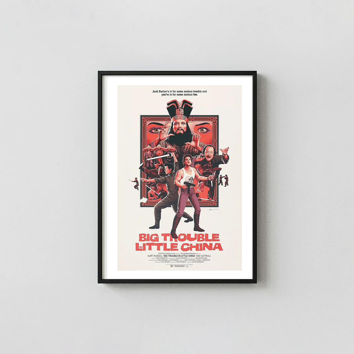 The striking composition utilizes a bold red and black palette, emphasizing the mystical and martial arts themes of the film. From Jack Burton’s signature tank top and boots to the looming, menacing figure of Lo Pan, every detail is rendered to celebrate the over-the-top adventure. Whether you are a lifelong fan of Kurt Russell’s wisecracking hero or you appreciate the distinctive visual language of 80s genre cinema, this print is the perfect way to commemorate one of Carpenter’s most beloved films. It’s more than just a poster; it’s a statement piece for your entertainment room, ready to bring the serious trouble and serious fun of the movie directly onto your wall.