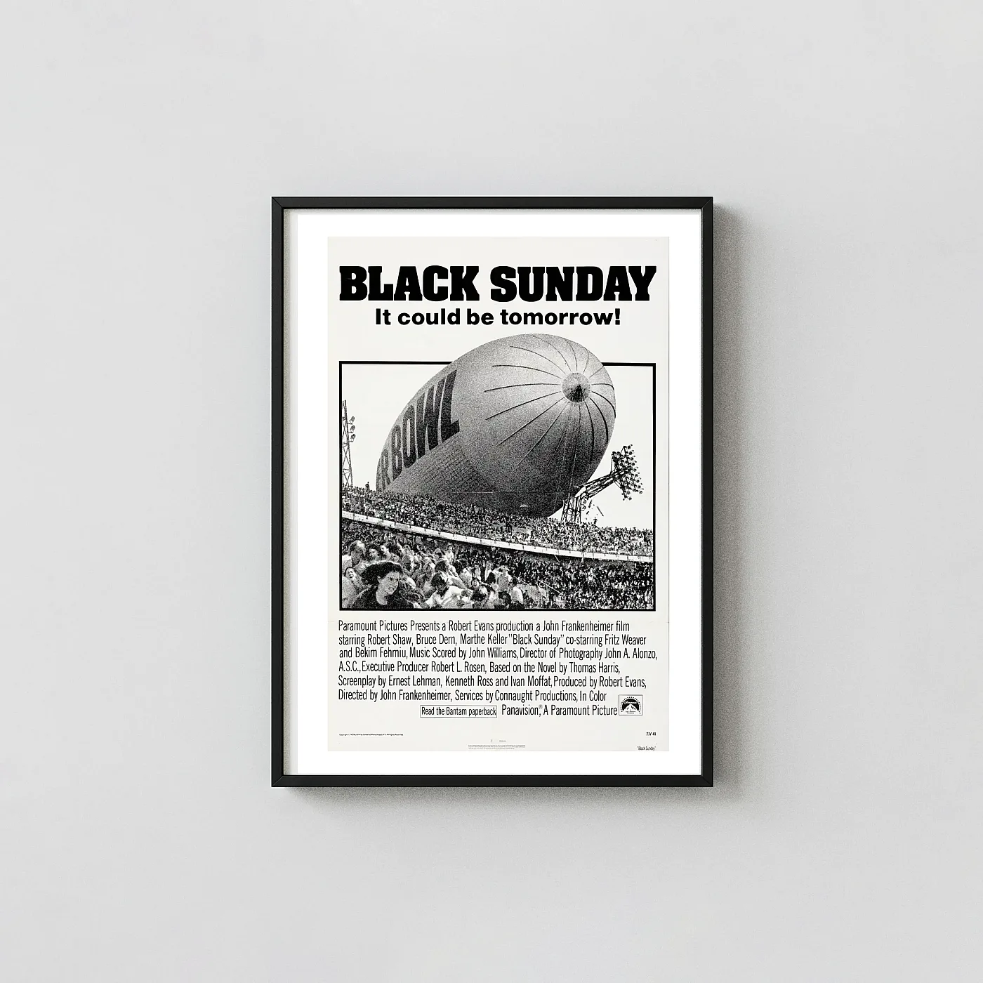 Relive the suspense of the classic 1977 terror film with this iconic Black Sunday movie poster. Directed by John Frankenheimer and scored by John Williams, this thriller cemented its place in cinema history. This striking piece of wall art captures the terrifying central image: the massive Super Bowl blimp crashing down over a panic-stricken stadium crowd. The stark, high-contrast visual and the chilling tagline, “It could be tomorrow!” make this poster a true collector’s item and a powerful statement piece for any movie enthusiast or collector of 70s film memorabilia.