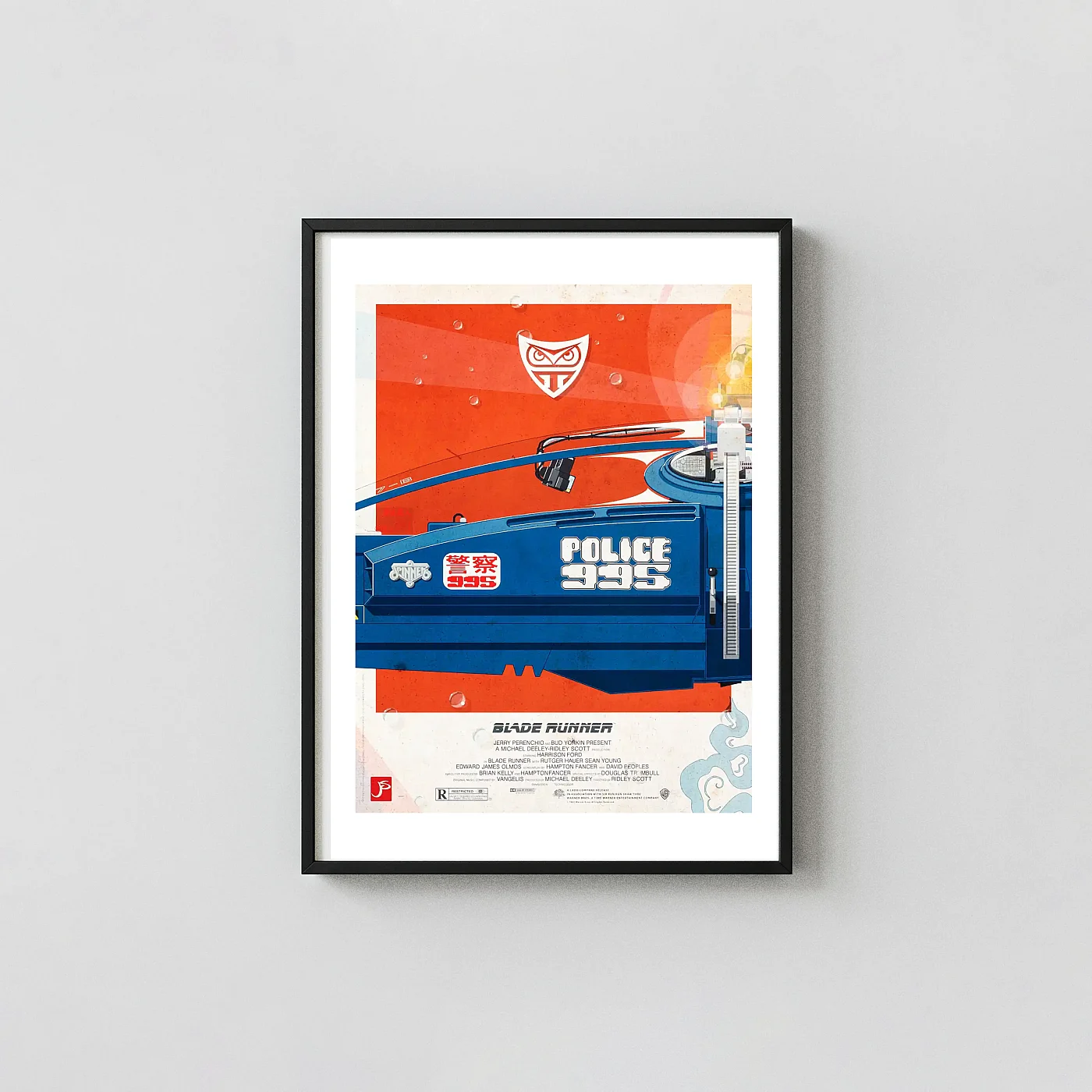 Step into the perpetually rainy, neon-drenched streets of future Los Angeles with this breathtaking *Blade Runner* poster, masterfully created by artist Jakob Staermose. This stunning piece focuses intently on the legendary LAPD Spinner, the flying police vehicle synonymous with Ridley Scott’s 1982 cyberpunk masterpiece. The vibrant blue chassis contrasts sharply against a stormy, orange backdrop, capturing the gritty yet beautiful dystopian atmosphere of the film. Detailed graphic elements, including the “POLICE 995” insignia, celebrate the distinct visual language that made *Blade Runner* a timeless cinematic achievement.