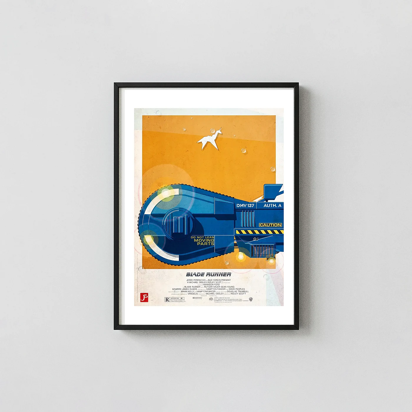 Official Blade Runner movie poster featuring the iconic Spinner vehicle and the pivotal origami unicorn. High-quality art print by Jakob Staermose. Perfect for sci-fi collectors.