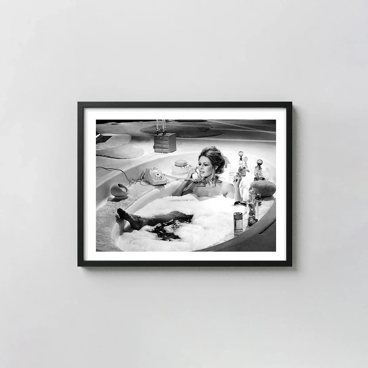 The Brigitte Bardot bathtub print in this listing operates in a very specific register of celebrity photography: the private moment rendered public, the behind-the-scenes image that reveals something genuine about its subject precisely because the formal distance of the studio portrait has been removed. Bardot in a bathtub is Bardot without the apparatus — no set dressing, no costume, no managed backdrop — and what the image shows is that without any of it, she was still entirely, completely, unmistakably herself. The black and white treatment gives this bathroom poster black and white wall art a tonal richness that removes any association with trivial titillation and places it firmly in the tradition of serious mid-century photography: intimate, honest, and thoroughly composed.