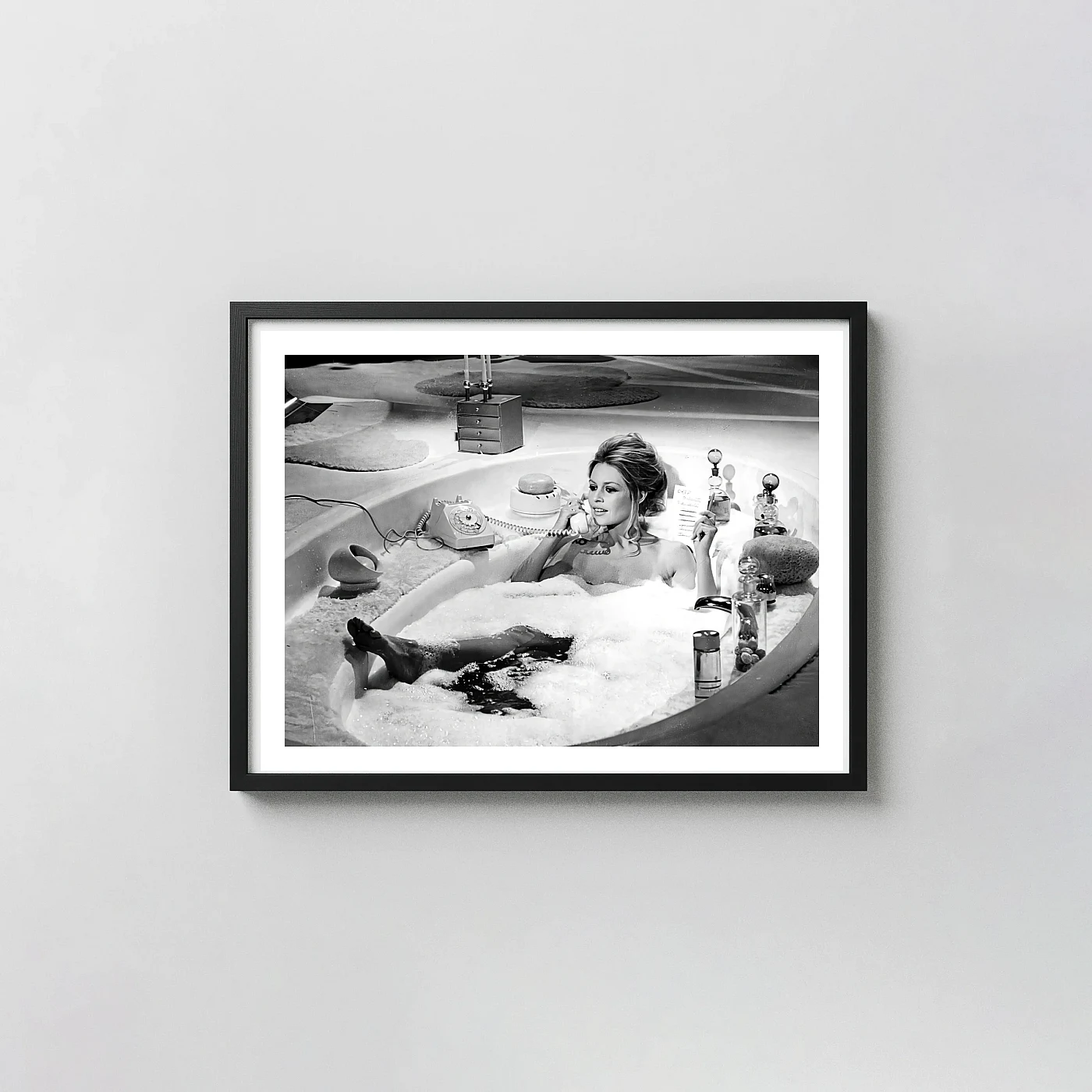 This Brigitte Bardot bathtub print captures Bardot in the room where the performance ends and the person begins — in a bathtub, in black and white, with the complete physical ease that was her most extraordinary quality and one that no amount of effort has ever successfully manufactured in anyone else.
