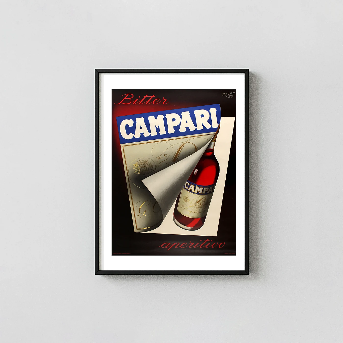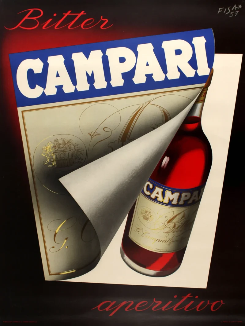 Iconic 1957 Campari poster by Fisac. Featuring the classic red bitter bottle dramatically revealed by peeling back a sheet of paper. Perfect mid-century Italian bar decor.