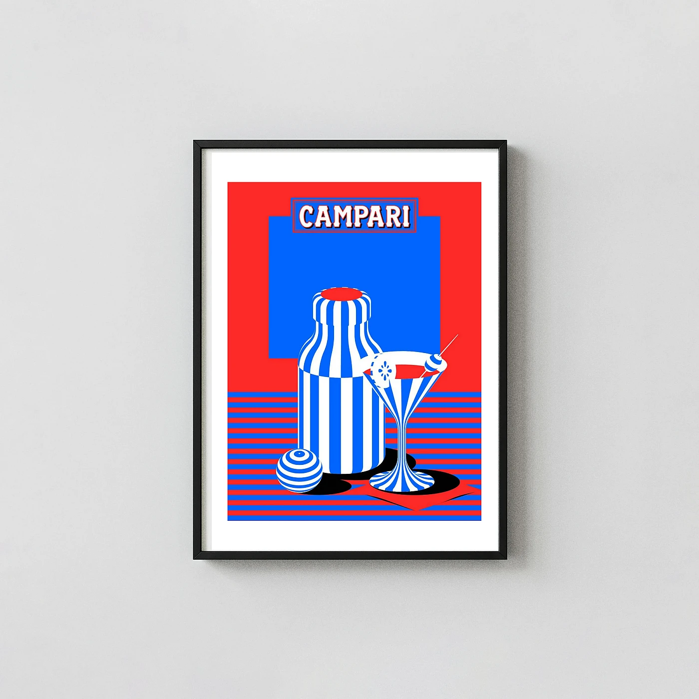 Elevate your space with this sensational Campari poster, a modern take on vintage Italian advertising that pushes the boundaries of visual design. This piece utilizes a striking, high-contrast palette of bold blue and vibrant red, transforming the classic Campari bottle and cocktail glass into mesmerizing works of op art. The vertical and horizontal stripes create a powerful optical illusion, giving the image a dynamic, almost vibrating energy that demands attention.