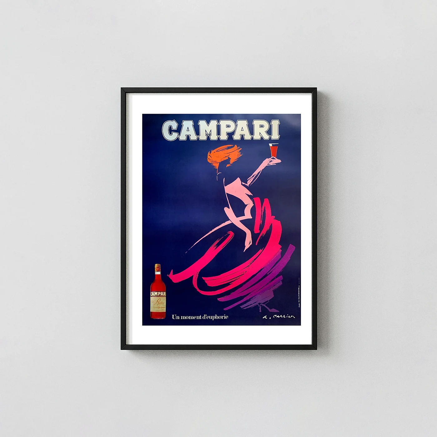 Capture the essence of 1980s commercial art and the timeless spirit of Italian aperitivo culture with this striking Campari poster. This dynamic piece, titled by the French tagline “Un moment d’euphorie” (A moment of euphoria), features bold, abstract brushstrokes that bring the central figure to life. The dancer, rendered in vivid pink, magenta, and orange, pops dramatically against the deep, sophisticated navy blue background, embodying movement and celebratory energy. It is a perfect convergence of advertising and fine art, designed to instantly elevate your space.
