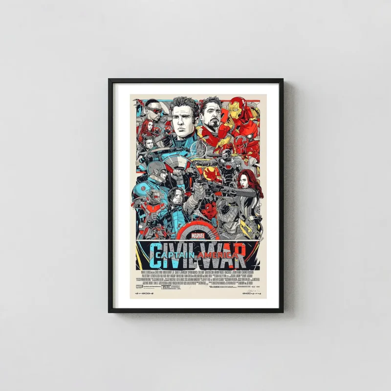 This artwork goes beyond a standard movie poster; it is a visual encyclopedia of the pivotal battle that redefined the Avengers. The bold lines, striking color palette (featuring Cap’s blue and Iron Man’s red), and the intense expressions of the characters reflect the high-stakes emotional weight of the film. Display this print to celebrate the complex themes of loyalty, freedom, and accountability that drive the conflict over the Sokovia Accords.