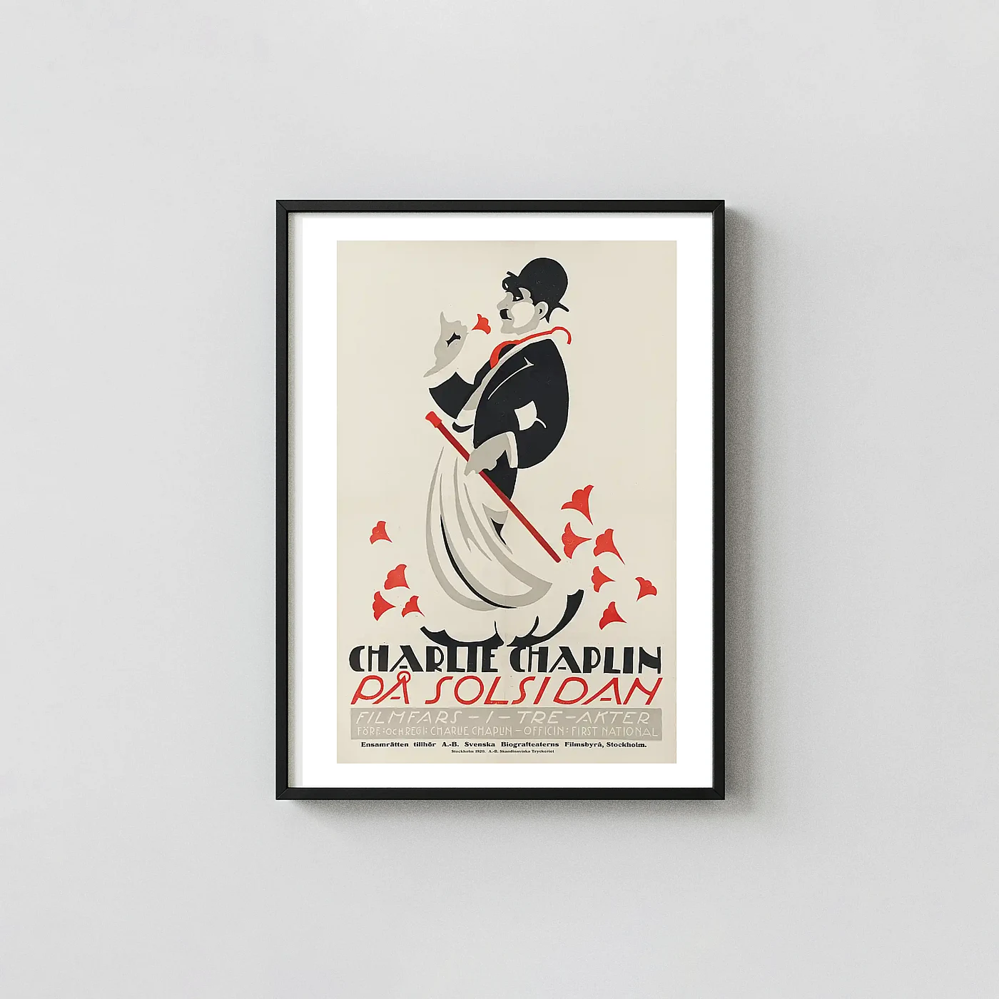 Celebrate the timeless genius of Charlie Chaplin with this exceptional reproduction of the rare 1919 Swedish movie poster for “På Solsidan” (known in English as “A Day’s Pleasure”). This stunning piece of cinematic history captures The Tramp in a highly stylized, Art Deco silhouette, blending classic silent film nostalgia with early 20th-century modern art. The bold graphic design, attributed to an unknown master, showcases a minimalist profile set against striking black, grey, and powerful red accents, making it a true collector’s wall art piece for any fan of classic cinema and graphic design.