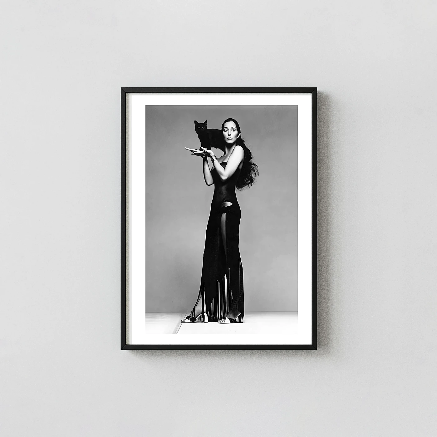A music room, living room, or bedroom gallery wall is the natural home for this Cher print — a space where the image can be appreciated at close range and where the full tonal depth of the Cher music black and white wall art reads at its richest. Against white or pale neutral walls, the contrast of the black and white photography is at its most dramatic; against deep-toned walls, the print takes on an intimate, spotlight quality that suits the subject perfectly. On a music icons gallery wall, this Cher print pairs naturally with prints from the same era and the same register of cultural significance — the women who defined popular music across the 1960s, 70s, 80s, and beyond.