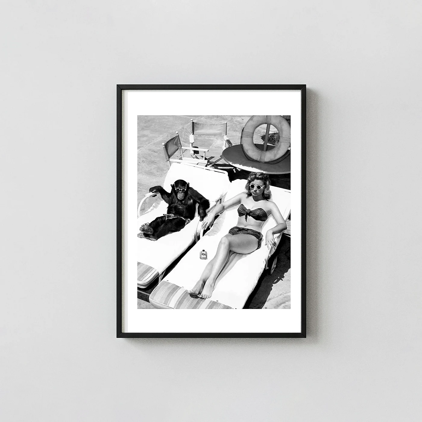 A sunroom, patio wall, poolside entertainment area, or conservatory is the most perfectly contextually appropriate home for this chimpanzee and a woman sunbathing print — beach energy meeting primate presence in exactly the right setting. A bathroom gives it the same deadpan surprise effect as the best funny black and white wall art does in an unexpected location. On a gallery wall alongside other vintage absurdist photography prints, this chimpanzee and a woman sunbathing print anchors the whole arrangement with irreplaceable specificity — there is simply no other print that does exactly what this one does, and a gallery wall of vintage humour needs it.
