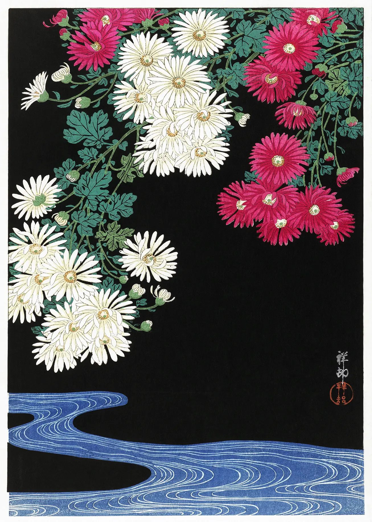 The visual structure of this Chrysanthemum woodblock print relies on a vertical cascade of flora. The white chrysanthemums, symbols of purity and the sun in Japanese culture, occupy the left foreground, while the red blossoms provide a warm, rhythmic balance on the right. Below the floral weight, a stylized blue stream flows horizontally, defined by thin, concentric white lines that suggest moving water. This specific Chrysanthemum woodblock print reflects the artist’s deep understanding of kacho-ga, or bird-and-flower painting, where the focus remains purely on the natural subject without distracting environmental elements.