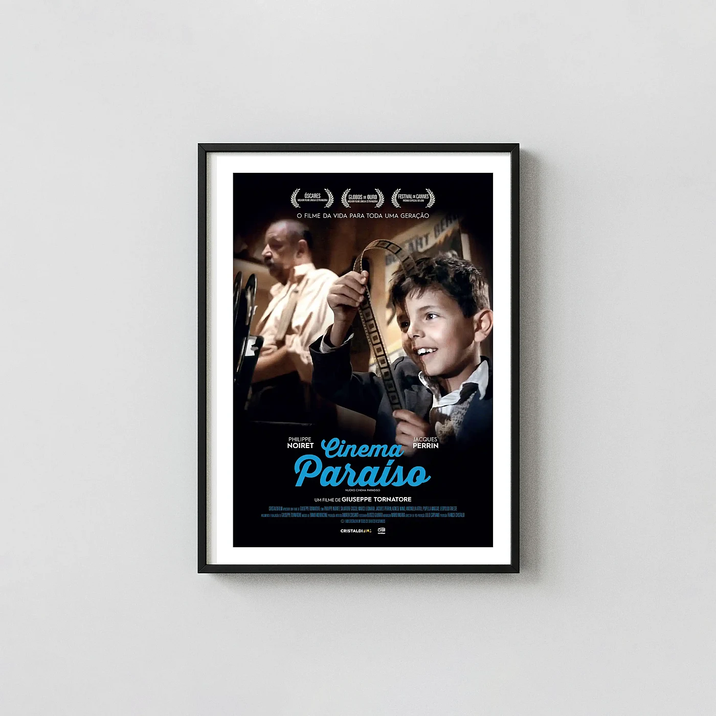 Relive the magic of Cinema Paradiso with this iconic movie poster featuring young Salvatore holding a film strip. Premium quality wall art print, the perfect gift for film lovers. Buy now!