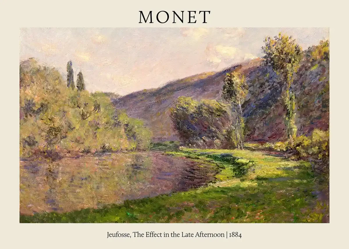 Capture the ethereal beauty of French Impressionism with this exquisite reproduction of Claude Monet’s 1884 masterpiece, Jeufosse, The Effect in the Late Afternoon. This painting is a quintessential example of Monet’s dedication to capturing ephemeral moments of light and color in natural settings. Executed near Giverny, the piece portrays a lush, vibrant riverbank scene as the sun dips low, casting deep, saturated shadows and warm, shimmering reflections on the water.