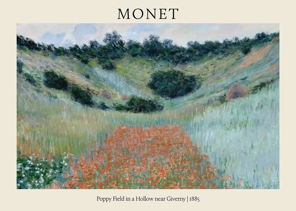 Immerse yourself in the breathtaking beauty of Claude Monet’s “Poppy Field in a Hollow near Giverny,” painted in 1885. This stunning reproduction captures the essence of French Impressionism, showcasing Monet’s revolutionary use of light and color to render a fleeting moment in nature. The piece centers on a vibrant explosion of red poppies nestled in a deeply contoured, grassy hollow near his beloved home in Giverny.