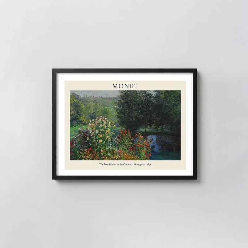 Capturing the vibrant Impressionism of 1876, this Monet poster features “The Rose Bushes in the Garden at Montgeron.” Perfect wall decor for art lovers.