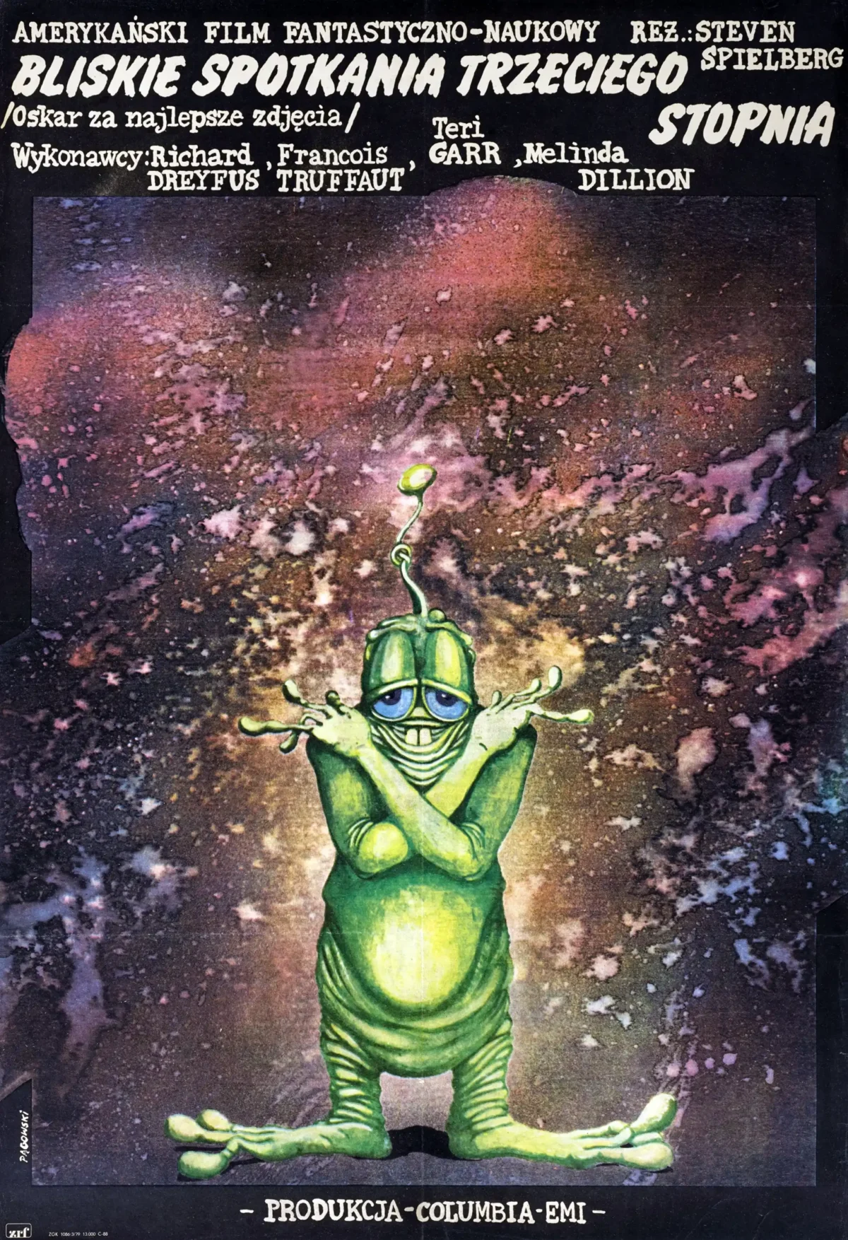 Capture the wonder and eccentricity of Steven Spielberg’s 1977 sci-fi masterpiece with this rare Polish variant poster. Unlike the traditional US marketing, this captivating European design features a distinctly stylized, cartoonish green alien standing against a vibrant, speckled cosmic background. Known in Poland as ‘Bliskie Spotkania Trzeciego Stopnia,’ this unique movie poster captures the imagination and serves as a powerful piece of alternative film history. It is a must-have piece of wall art for serious collectors and fans of classic 70s cinema.