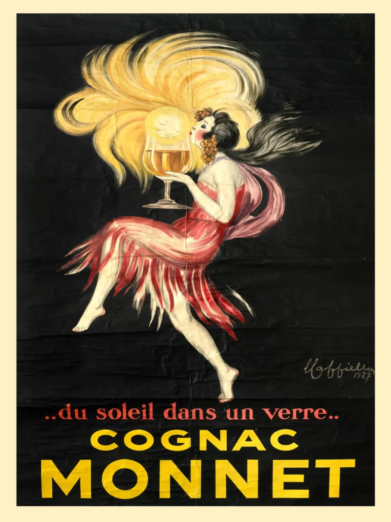 Capture the glamour of 1927 with this stunning Cognac Monnet vintage Art Deco poster. Featuring the iconic “Du Soleil dans un verre” design, perfect for bar decor and collectors.