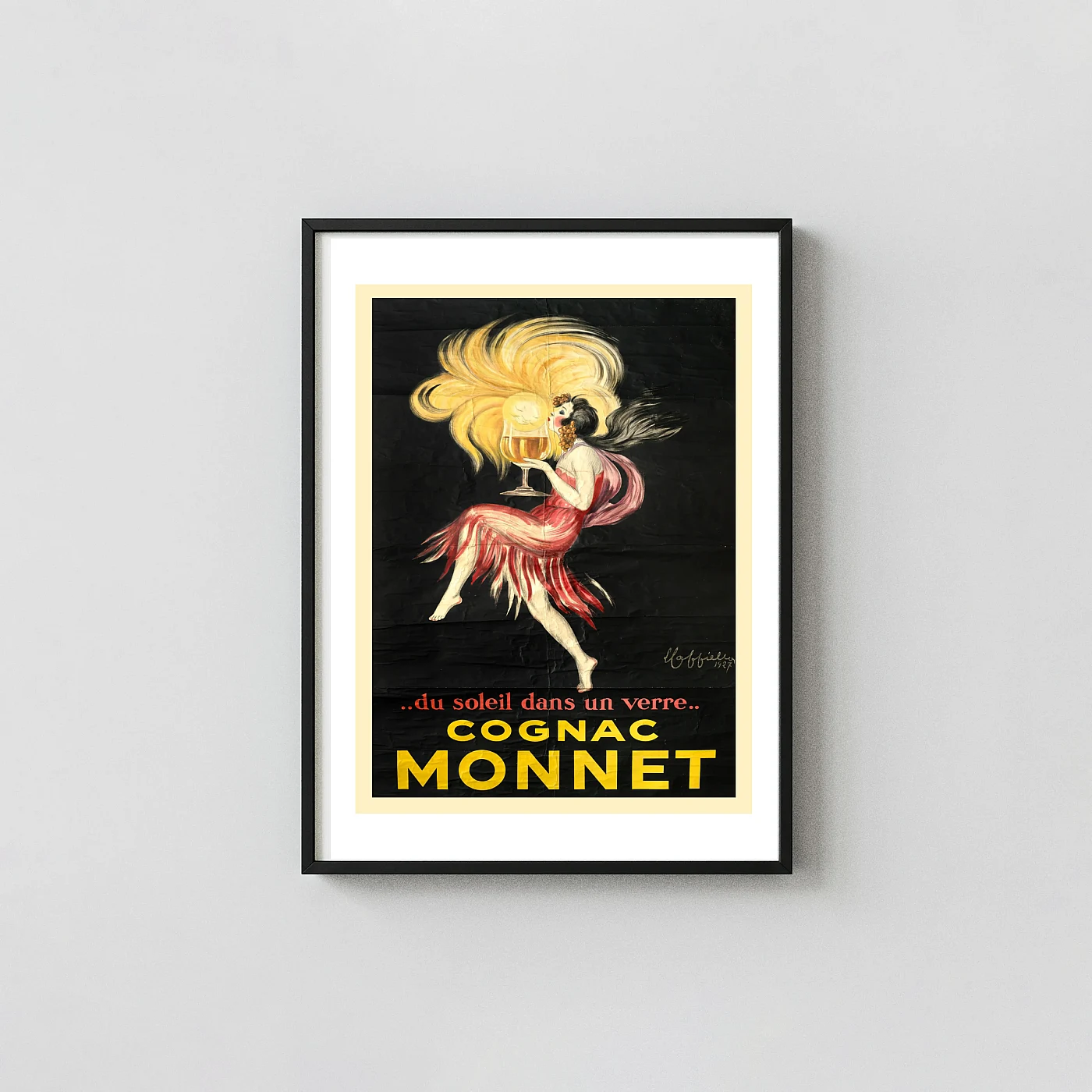 Step back into the roaring twenties with this exquisite reproduction of the 1927 Cognac Monnet advertising poster. Created in the evocative Art Deco style, this piece perfectly embodies the glamour and sophisticated exuberance of the era. The poster, famously captioned “Du Soleil dans un verre” (Sun in a glass), elevates brandy advertising to an art form that captivates the viewer with its energy and bold design.