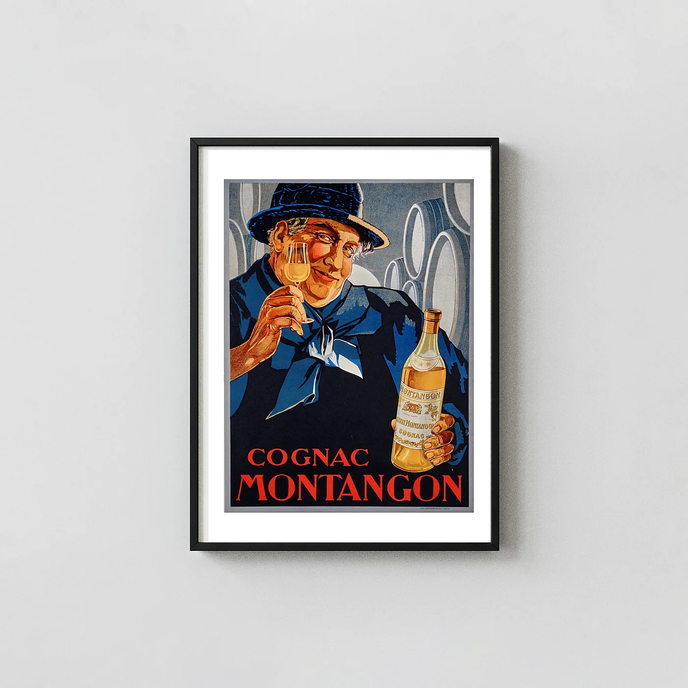 This captivating poster is a stunning reproduction of a classic advertisement for Cognac Montangon, showcasing the luxurious appeal of French spirits from the early 20th century. The artwork features a beaming, well-dressed gentleman in a dark fedora and a stylish blue scarf, holding both a snifter of the rich amber liquid and a bottle of the celebrated cognac. The backdrop suggests a traditional cellar, with large aging barrels emphasizing quality and heritage.