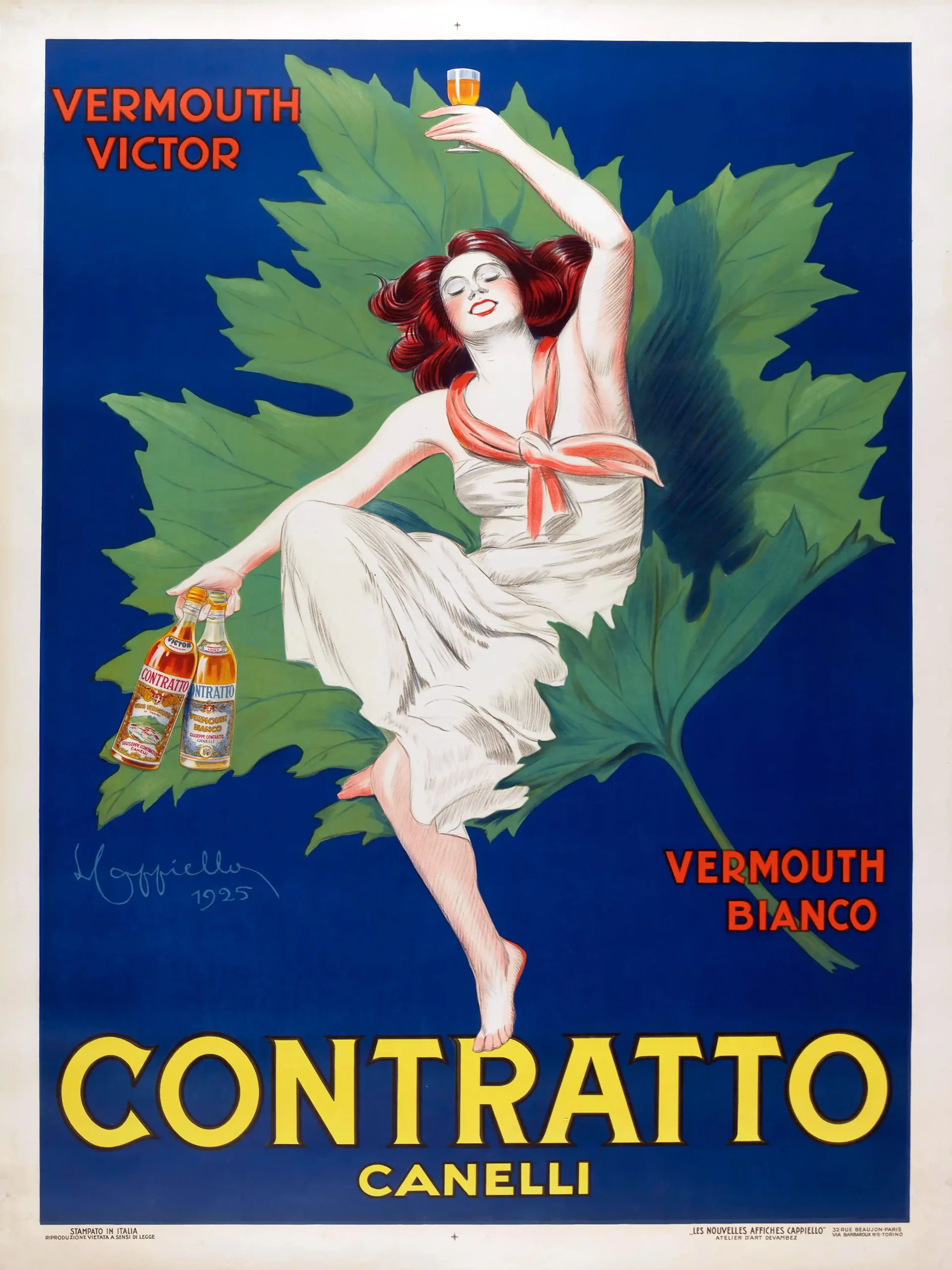 Celebrate the golden age of Italian advertising with this iconic 1925 Contratto Vermouth Bianco and Victor poster by Leonetto Cappiello. Perfect for bar decor.