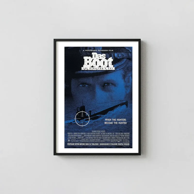 Capture the intense psychological drama of Wolfgang Petersen’s masterpiece, Das Boot (The Director’s Cut). This powerful movie poster features the iconic juxtaposition of the U-96 submarine being viewed through a target scope, set against the watchful, intense gaze of the Captain. The dramatic blue and black tones perfectly convey the suffocating tension of life aboard a WWII U-boat. It’s a striking piece of cinematic wall art for any true fan of historical war films.