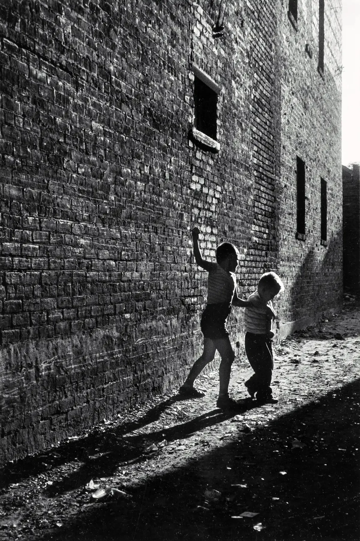 Capture the profound humanism and dramatic visual style of acclaimed American photographer, Dave Heath, with this striking black and white print. Featuring two children walking along a massive, textured brick wall, the image utilizes intense light and shadow play to create a sense of atmosphere, movement, and perhaps, isolation. This photograph is a prime example of mid-century street photography, capturing fleeting moments of life and emotion within the stark reality of the urban environment. It’s an essential piece for collectors who appreciate visual storytelling and high-contrast composition.