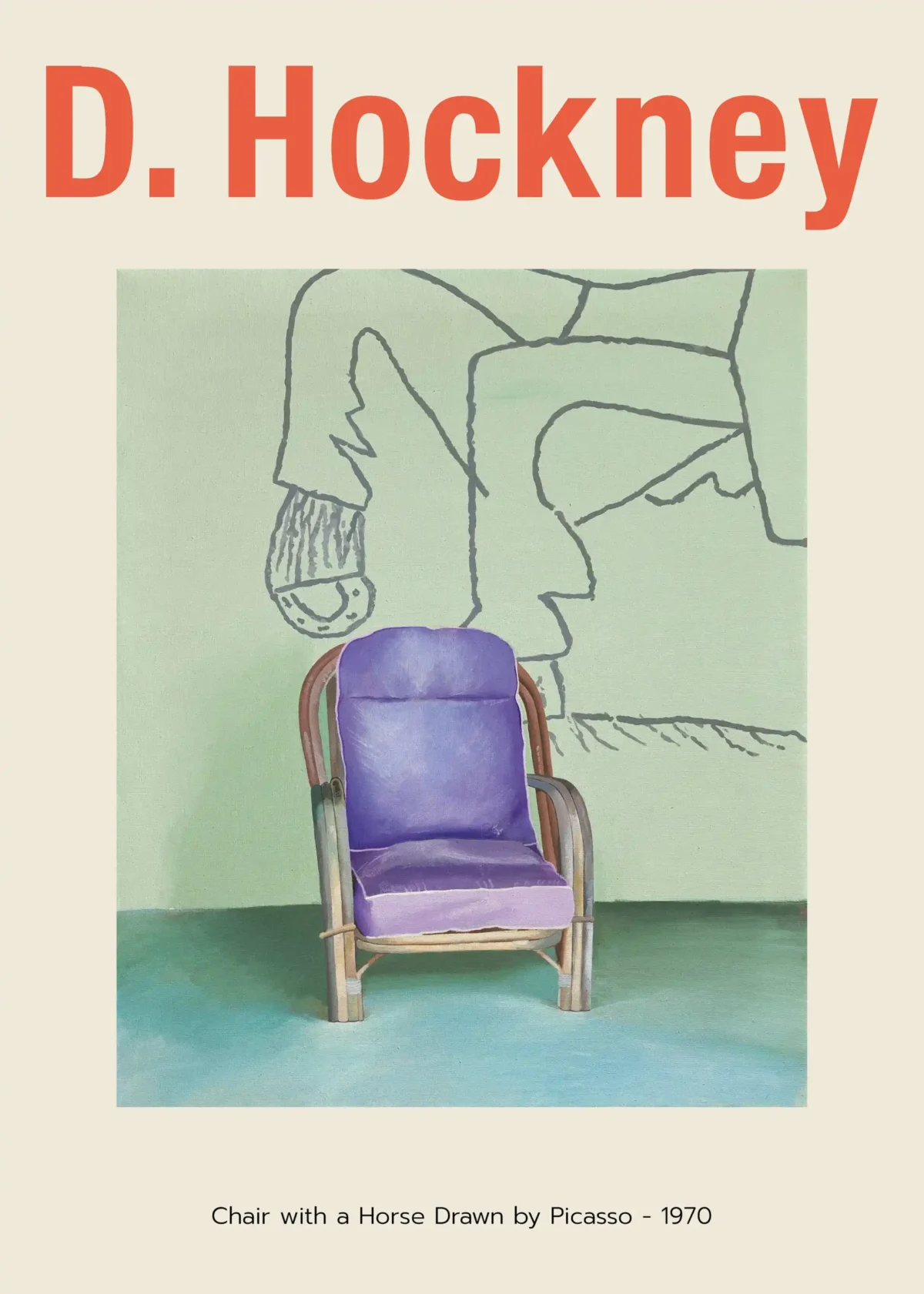 Bring the sophisticated wit and vibrant palette of one of Britain’s greatest living artists into your space with this stunning poster featuring David Hockney’s 1970 painting, Chair with a Horse Drawn by Picasso. This piece exemplifies Hockney’s ability to merge different artistic styles and references within a single, striking composition. The poster features the bold, block lettering of Hockney’s name in a striking coral hue, framing the central image beautifully.