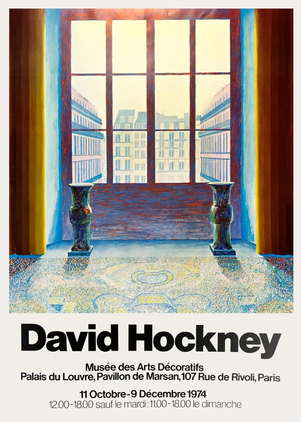 The image depicts an interior view—possibly a museum gallery—centered around a grand window overlooking a classic Parisian street scene. Hockney employs a vibrant, saturated color palette and a distinct, almost pointillist texture on the floor, contrasting sharply with the structural lines of the window frame and the city buildings outside. The interplay of warm light flooding in and the deep blues and reds of the interior creates an electrifying visual effect. Flanking the window, two classical vases anchor the foreground, drawing the eye through the room and into the sun-drenched cityscape.