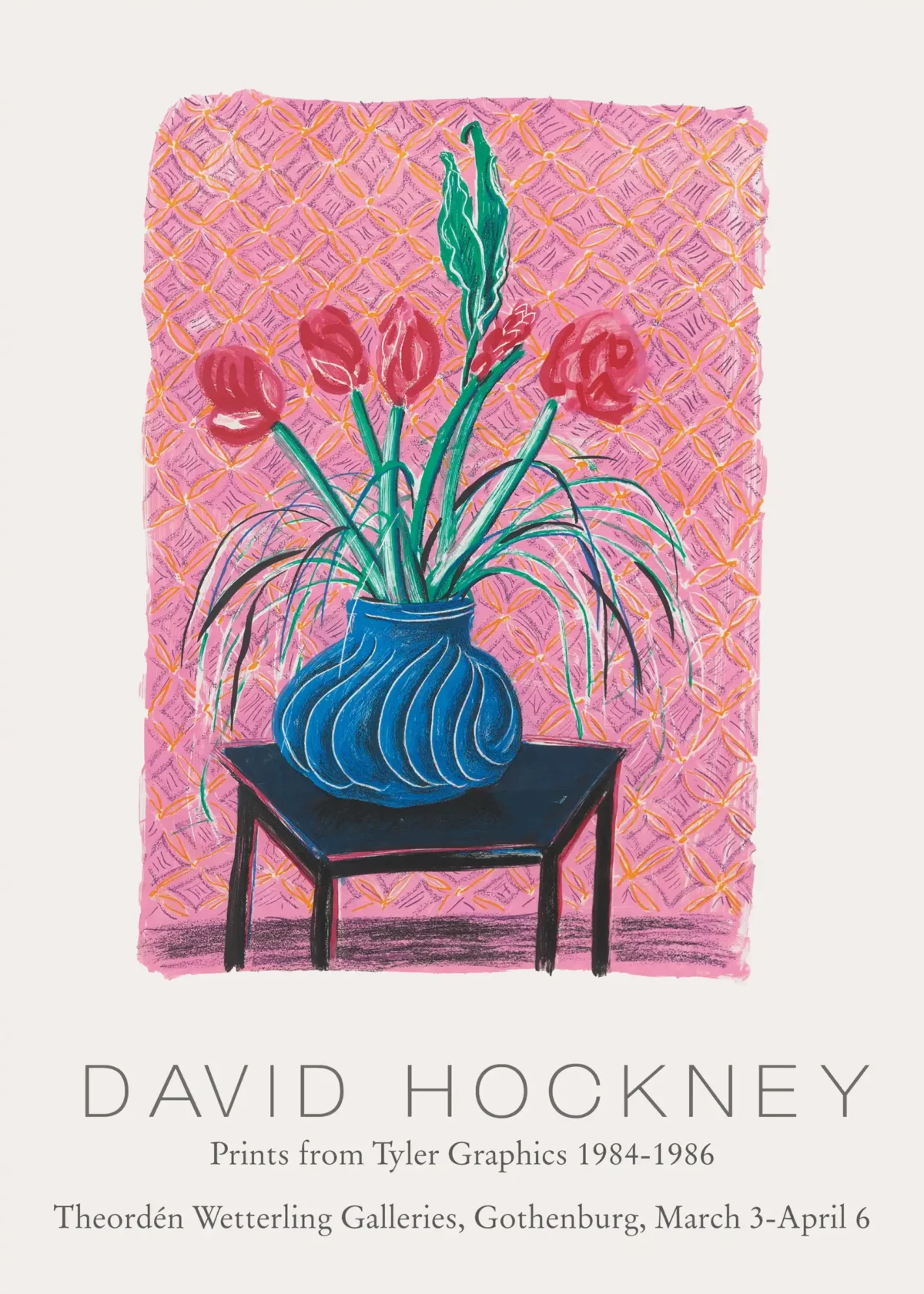 Adorn your walls with this iconic exhibition poster advertising the David Hockney ‘Prints from Tyler Graphics 1984-1986’ show. This piece perfectly encapsulates Hockney’s playful use of color and graphic composition during the mid-1980s, merging modern sensibility with traditional still life subject matter.