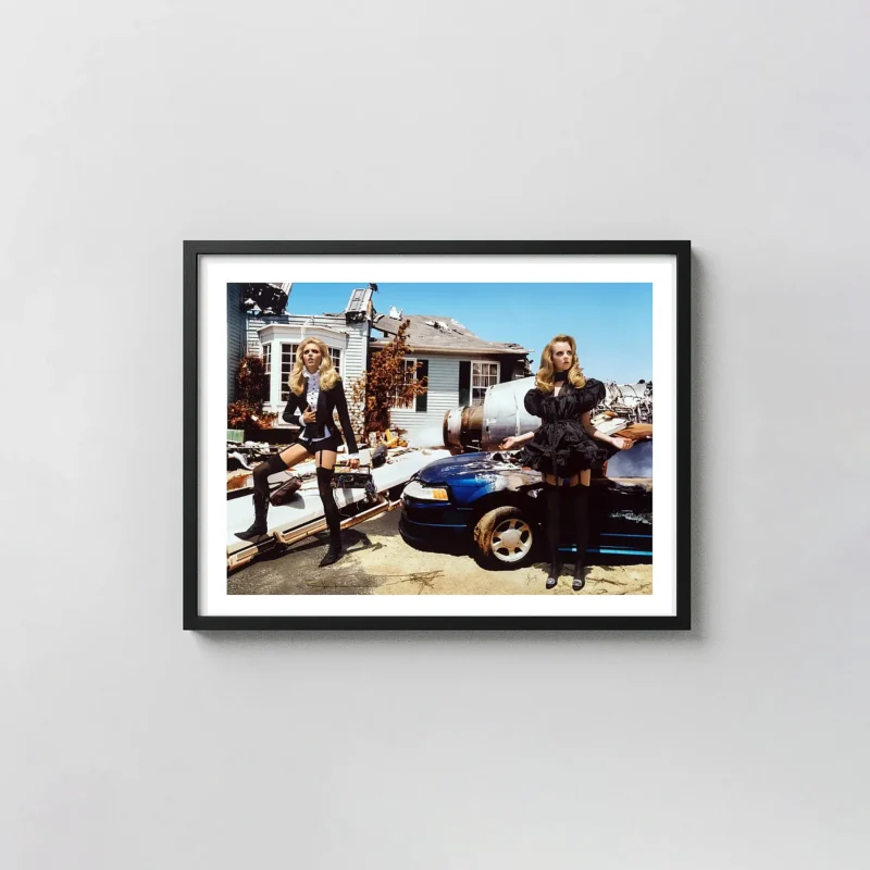 Captivate your guests with this striking fine art photography poster by the iconic David LaChapelle. Known for his hyper-saturated, provocative imagery, this piece perfectly encapsulates the artist’s signature style—blending glamorous fashion models with scenes of surreal chaos and destruction. This print features two dramatically styled figures posing amidst the wreckage of a suburban home, a burnt-out car, and a massive crashed jet engine fragment, challenging conventions of beauty and consumerism. It is a powerful, conversation-starting piece of contemporary wall art.