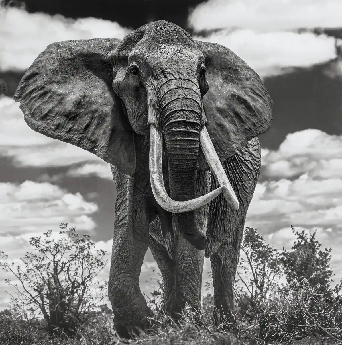 Capture the intense power and raw beauty of the African elephant with this high-impact, black and white wall art. This magnificent photograph, reminiscent of the signature style of renowned wildlife artists like David Yarrow, utilizes a dramatic, low-angle perspective to emphasize the sheer size and imposing nature of the majestic tusker. The deep contrast between the rough texture of the elephant’s skin and the expansive, cloudy sky creates a striking piece of decor guaranteed to dominate any room. This print is a powerful statement about the grandeur of nature and conservation.